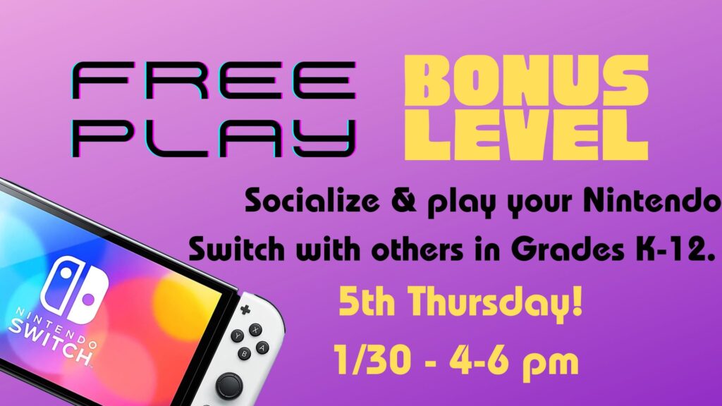 Special Dates are just for the 5th Thursday of the month! Bring your switch and your favorite games. We can discuss the games you love and the techniques that get you to the finish! Talk to other gamers and play with other Nintendo(tm) enthusiasts. Switch not provided. Games can be taken out with your library card! Open to all school-age kids, tweens, and teens! |
